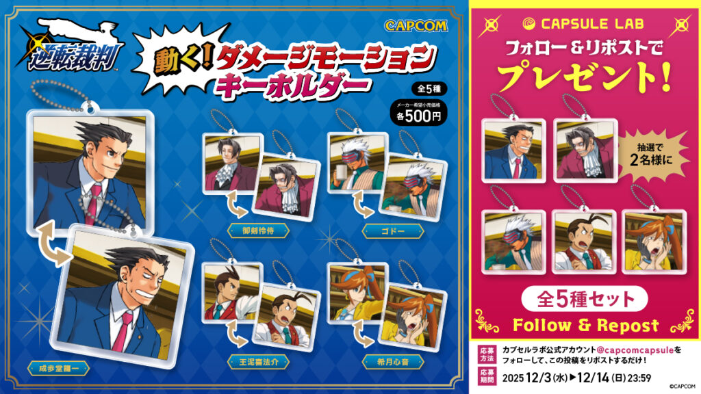 カプセルトイ新商品「逆転裁判 動く! ダメージモーションキーホルダー」が当たる!フォロー&リポストキャンペーン開催!