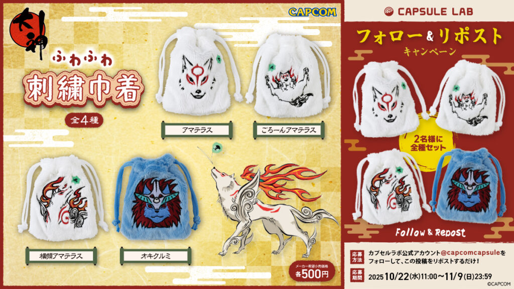 カプセルトイ新商品「大神 ふわふわ刺繍巾着」が当たる!フォロー&リポストキャンペーン開催!