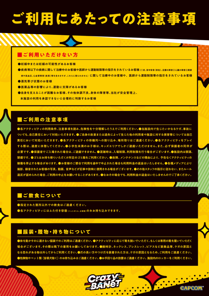 ■本規約は、株式会社カプコン(以下「当社」といいます)が運営する屋内型アミューズメント施設(以下「本施設」といいます)の利用に関する条件を定めるものです。
