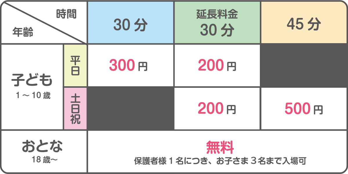 - 0歳児のお子様は付き添い入場(無料)出来ますがご遊戯いただけません。