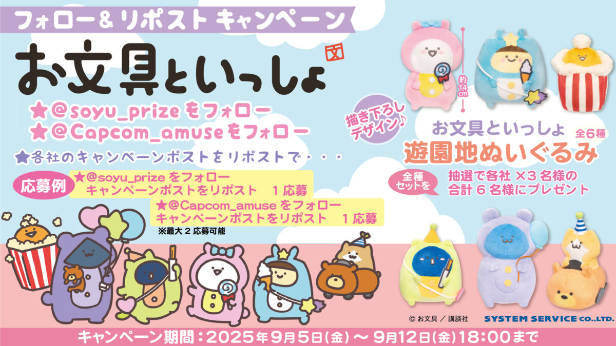 ほんわか和む癒し系キャラ「お文具といっしょ」から、描き下ろしイラストを使用したぬいぐるみがプライズに登場します!発売を記念して、豪華景品が当たるキャンペーンを開催いたします!