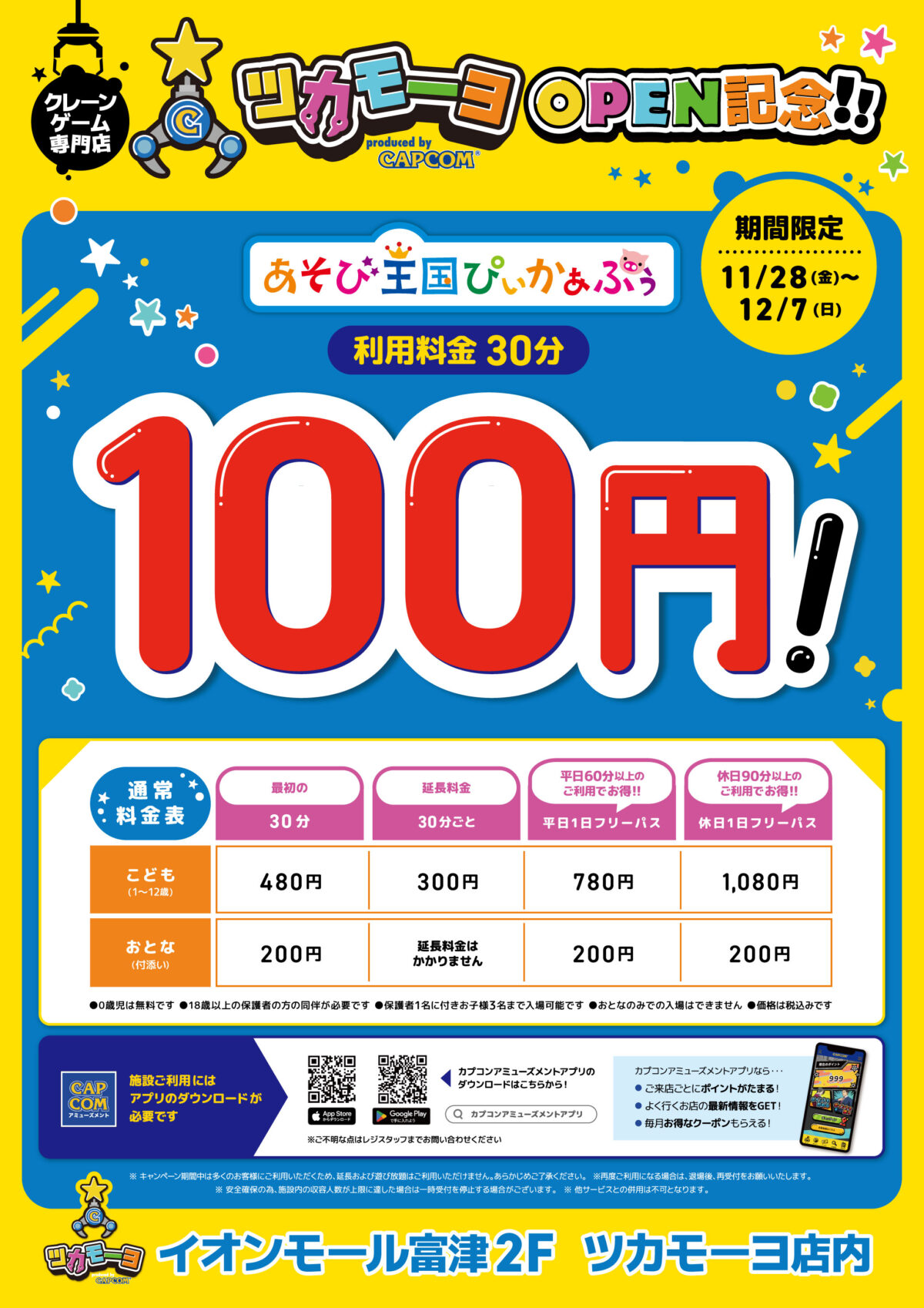 「ツカモーヨ」のオープンを記念して、店内に併設している、お子様向けの屋内遊具施設「あそび王国ぴぃかぁぶぅ 富津店」が期間限定で100円でご利用できるイベントを実施いたします。