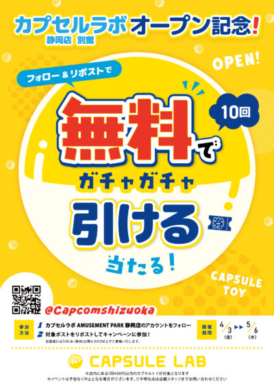 「カプセルラボ静岡店 別館」オープン記念!「ガチャ10回無料券」が当たる! フォ...