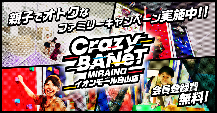 「Crazy BANeT 白山店」では、2024年2月1日(木)~2024年2月29日(木)までの期間中、3歳~小学生未満のお客様と付き添いの保護者様限定で、キッズエリア(ポケットパーク)ご利用料金が、通常60分1,000円のところ、最大半額の500円になる「ファミリーキャンペーン」を開催いたします。