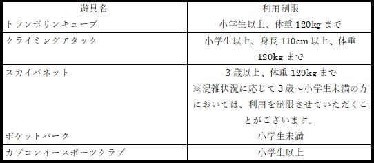 当社は、本施設の安全管理を目的として、本施設における各種遊具ごとに以下の利用制限を定めております。お客様が利用制限の基準を満たさない場合は、当該遊具を利用することはできません。