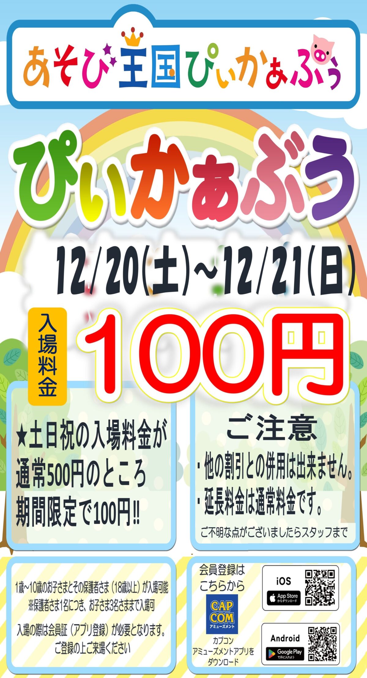 あそび王国ぴぃかぁぶぅの入場料金が期間限定で特別価額でのご案内となります。