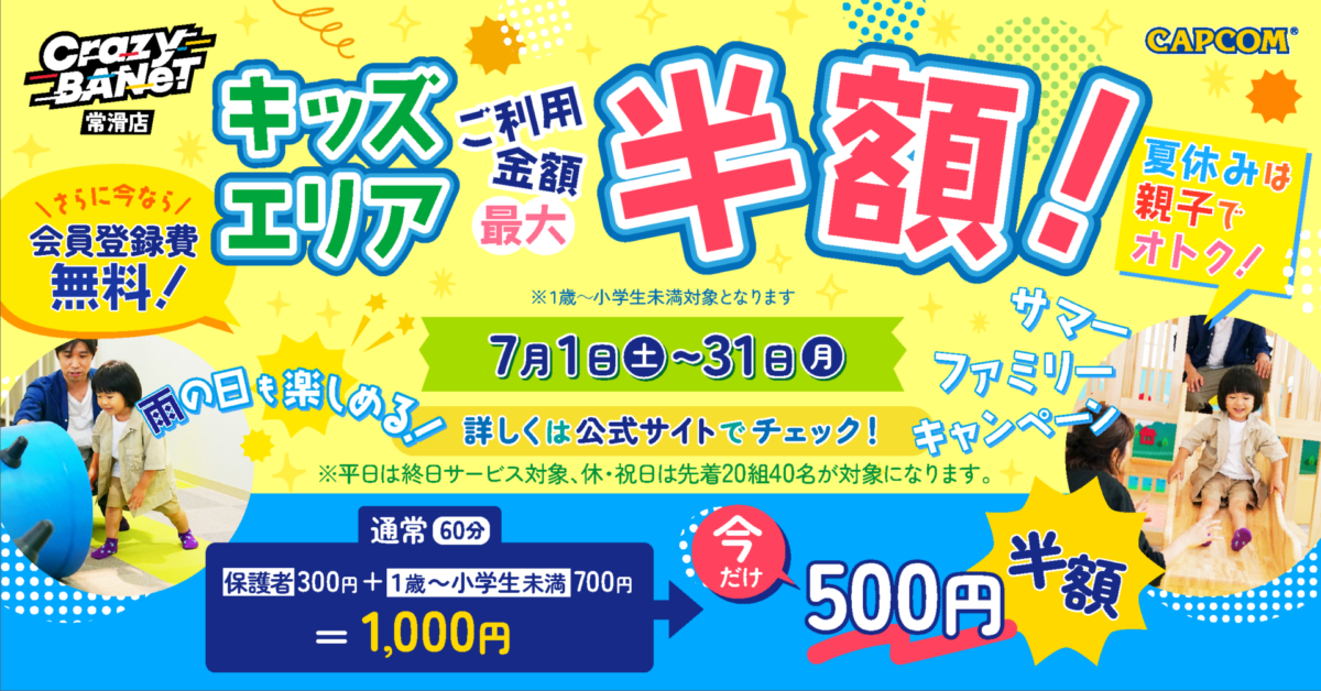 「Crazy BANeT 常滑店」では、2023年7月1日(土)~2023年7月31日(月)までの期間中、1歳~小学生未満のお客様と付き添いの保護者様限定で、キッズエリア(KIDS BANeT)ご利用料金が、通常60分1,000円のところ、最大半額の500円になる「サマーファミリーキャンペーン」を開催いたします。