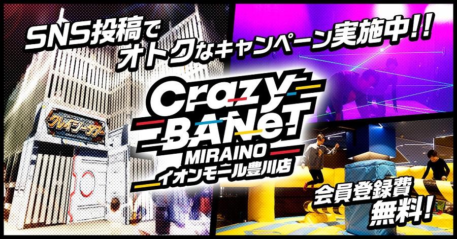 「Crazy BANeT 豊川店」店内写真及びハッシュタグ「#クレイジーバネット」つきのSNS投稿画面を退館時にスタッフまでご提示いただくと、延長料金30分が無料になります