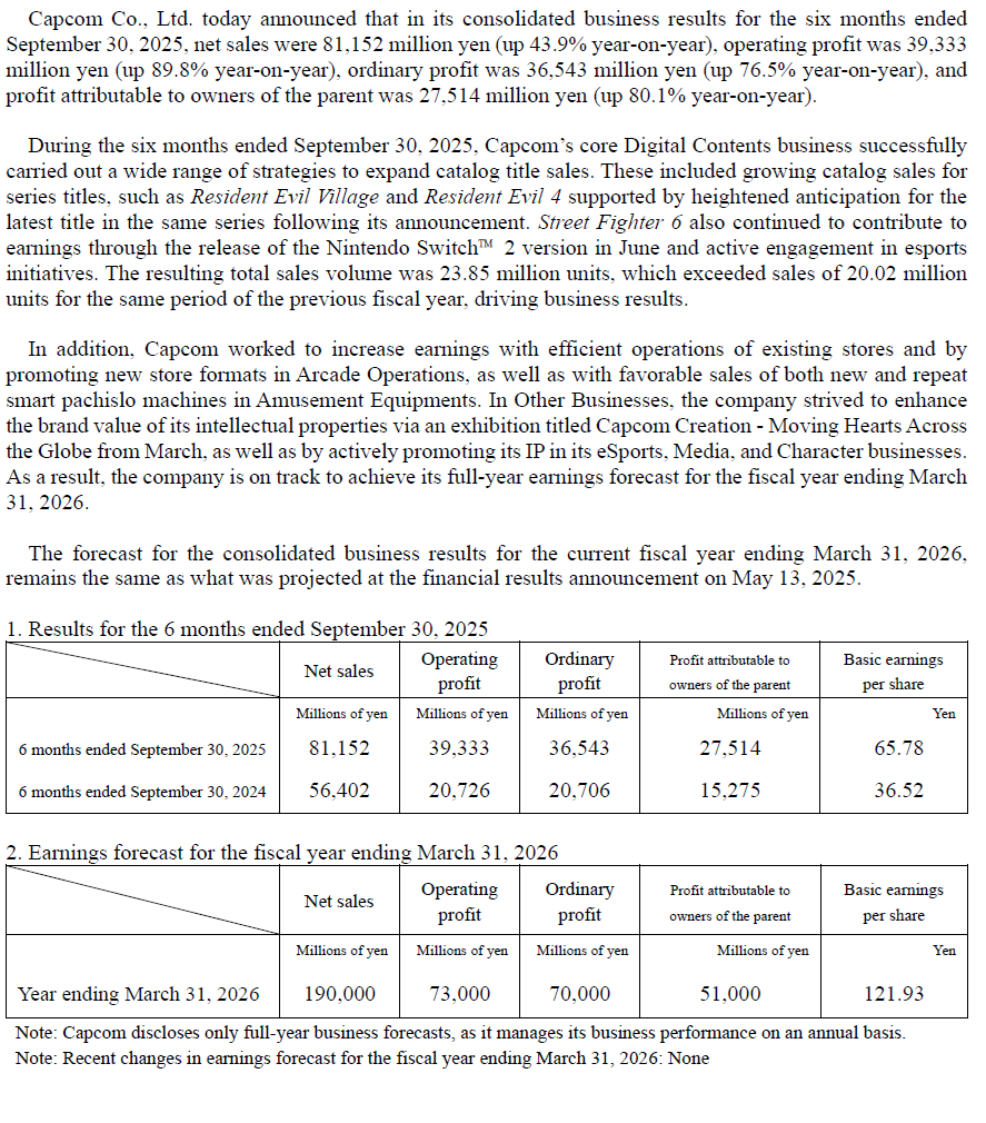 Capcom’s Consolidated Results for the Six Months Ended September 30, 2025