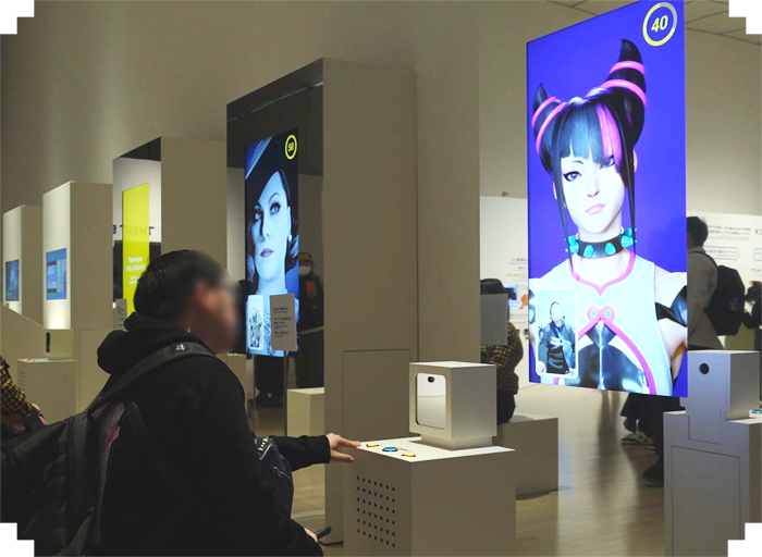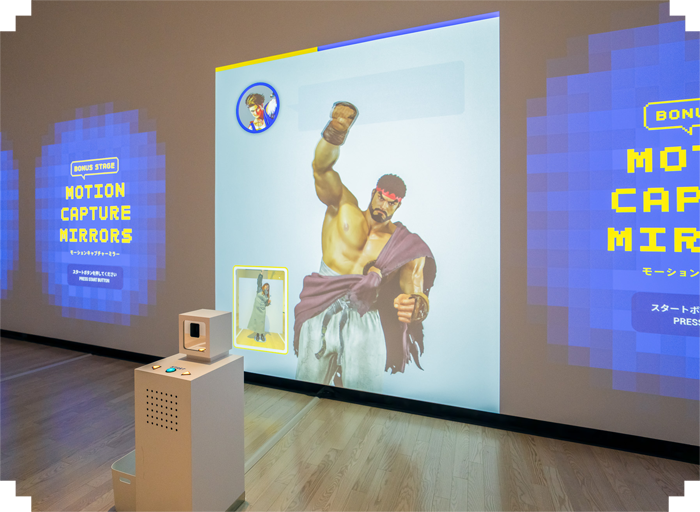 特殊なスーツや機材を使うことなく、ゲーム開発に欠かせないモーションキャプチャーを体験できるコーナー。当社の人気キャラクターになりきり、アクションを繰り出せる。